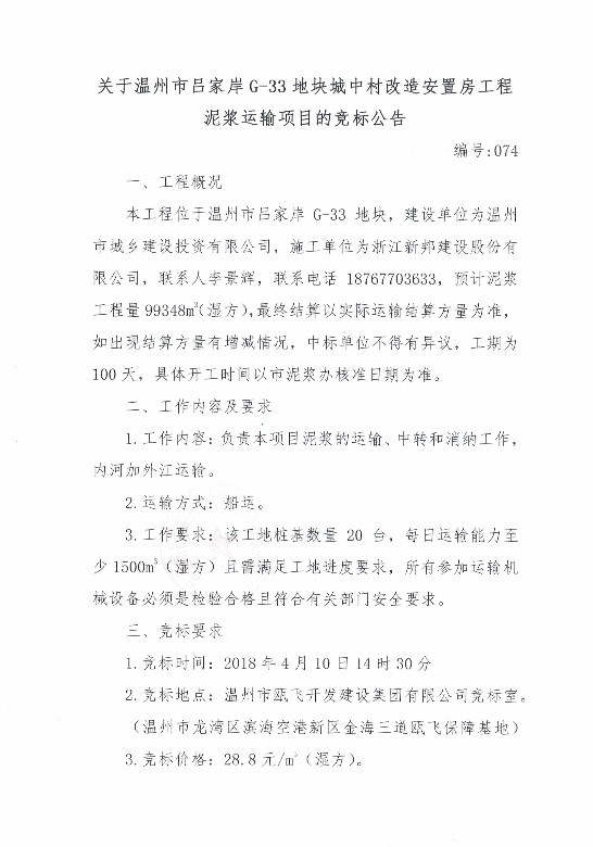 ¹ØÓÚÎÂÖÝÊÐÂÀ¼Ò°¶G-33µØ¿é³ÇÖдåˢа²¶Ù·¿¹¤³ÌÄཬÔËÊäÏîÄ¿µÄ¾º±êͨ¸æ