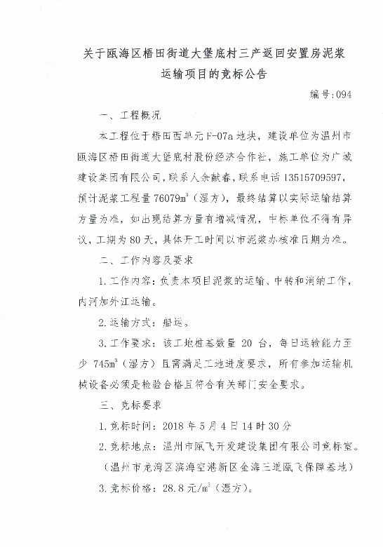¹ØÓÚ걺£ÇøÎàÌï½ÖµÀ´ó±¤µ×´åÈý²ú·µ»Ø°²¶Ù·¿ÄཬÔËÊäÏîÄ¿µÄ¾º±êͨ¸æ